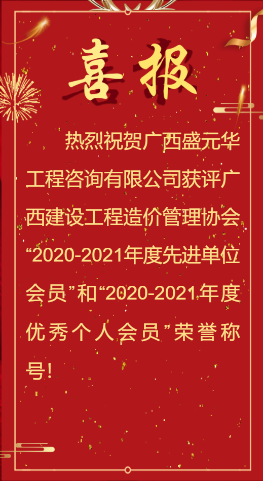 | 【喜訊】熱烈祝賀廣西盛元華獲評(píng)廣西建設(shè)工程造價(jià)管理協(xié)會(huì)“2020-2021年度先進(jìn)單位會(huì)員、優(yōu)秀個(gè)人會(huì)員”兩項(xiàng)榮譽(yù)稱(chēng)號(hào) |