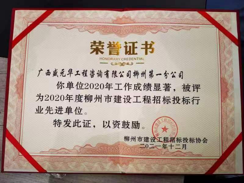 喜訊!熱烈祝賀廣西盛元華集團(tuán)旗下柳州一分公司榮獲2020年度"柳州市建設(shè)工程招標(biāo)代理行業(yè)先進(jìn)單位"的榮譽(yù)稱號(hào)