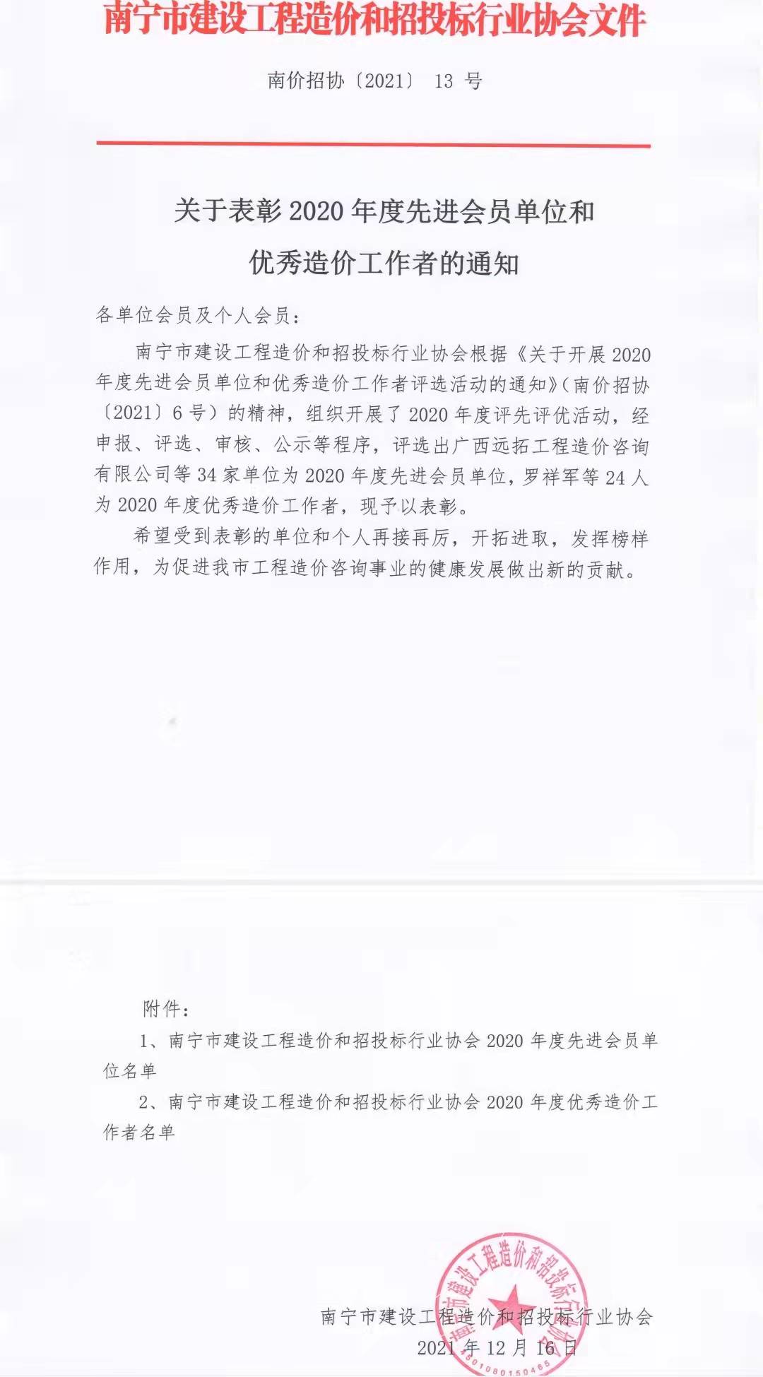 12月16日,南寧市建設(shè)工程造價(jià)和招投標(biāo)協(xié)會發(fā)布年度評先評優(yōu)活動的表彰通知,我公司以優(yōu)秀的業(yè)績,良好的誠信評價(jià),再次榮獲南寧市建設(shè)工程造價(jià)和招投標(biāo)協(xié)會“2020年度先進(jìn)會員單位”榮譽(yù)稱號。